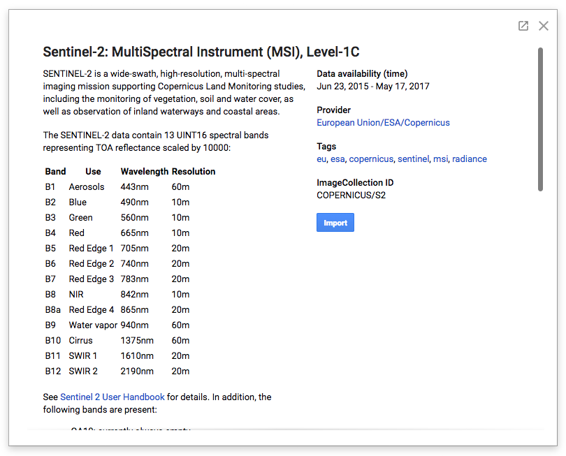 En este caso, vemos en el lado derecho de la ventana que se trata de un recurso de colección de imágenes cuya ruta es COPERNICUS/S2.