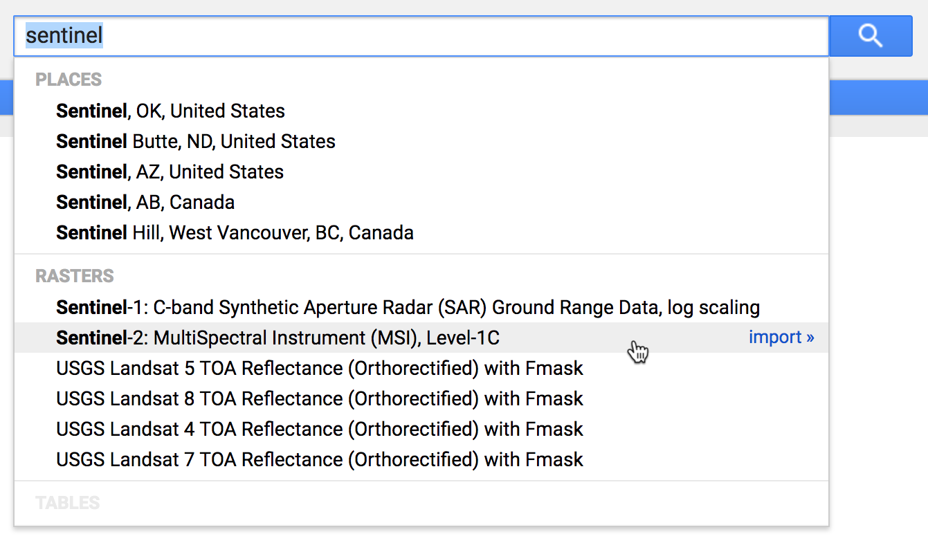 Puedes buscar y explorar los conjuntos de datos disponibles con el Editor de código de Earth Engine en code.earthengine.google.com. Busquemos algunos datos de Sentinel 2. (Si es la primera vez que usas el editor de código, se te pedirá que lo autorices para acceder a Earth Engine en tu nombre cuando accedas). En el editor de código, busca "centinela" en el cuadro de búsqueda de la parte superior. Aparecerán varios conjuntos de datos ráster: