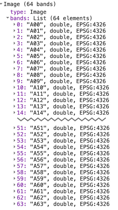 You will see that the image has 64 bands, named A00, A01, … , A63. Each band contains the value of the embedding vector for the given year in that dimension or axis. Unlike spectral bands or indices, individual bands have no independent meaning – rather, each band represents one axis of the embedding space. You would use all of the 64 bands as inputs for your downstream applications.