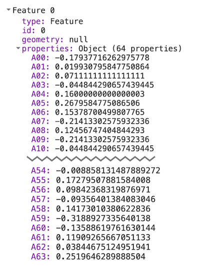 If you print the values of the first sample, you’ll see it has 64 band values defining the embedding vector for that pixel. The embedding vector is designed to have a unit length (i.e., the length of the vector from the origin (0,0,....0) to the values of the vector will be 1).