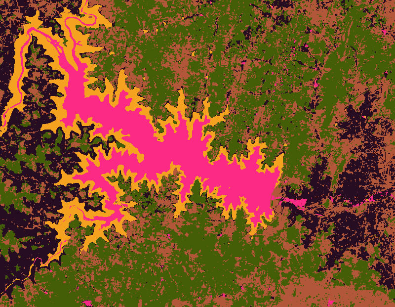 You will notice that the resulting clusters have very clean boundaries. This is because the embeddings inherently include spatial context - pixels within the same object would be expected to have relatively similar embedding vectors. Also, one of the clusters includes areas with seasonal water around the main reservoir. This is due to the temporal context that is captured in the embedding vector that allows us to detect such pixels with similar temporal patterns.