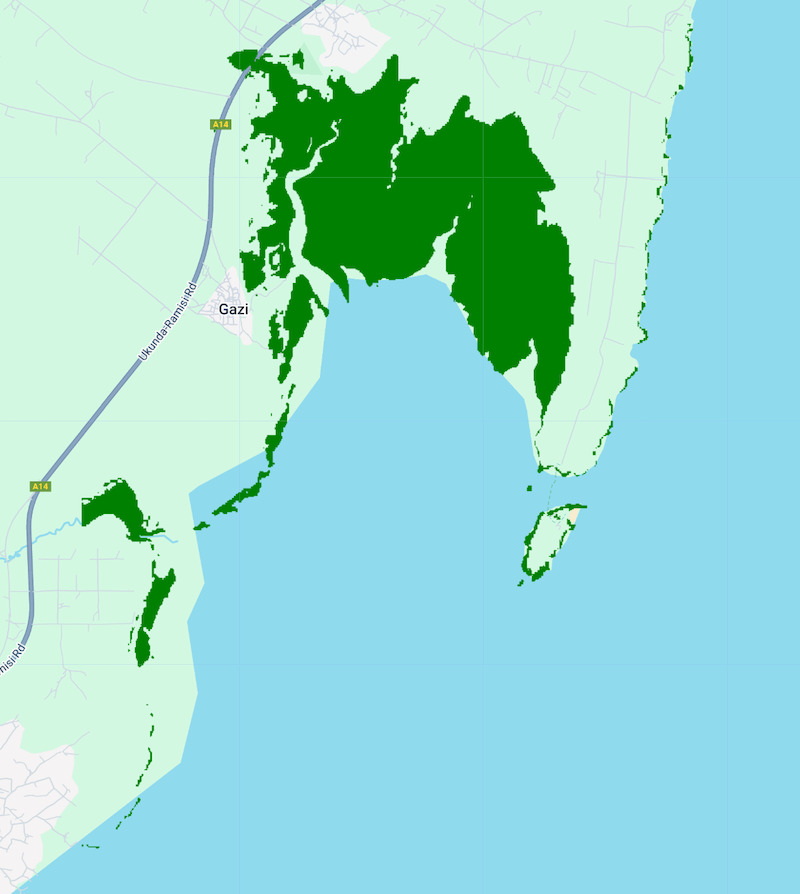 Notice that there is a close match between the global mangrove watch results and the output of the low-shot classification of the Satellite Embedding dataset. If you switch the basemap to Satellite, you will see that the Satellite Embedding classification has also captured the finer details of the landscape missing from the global mangrove watch classification.