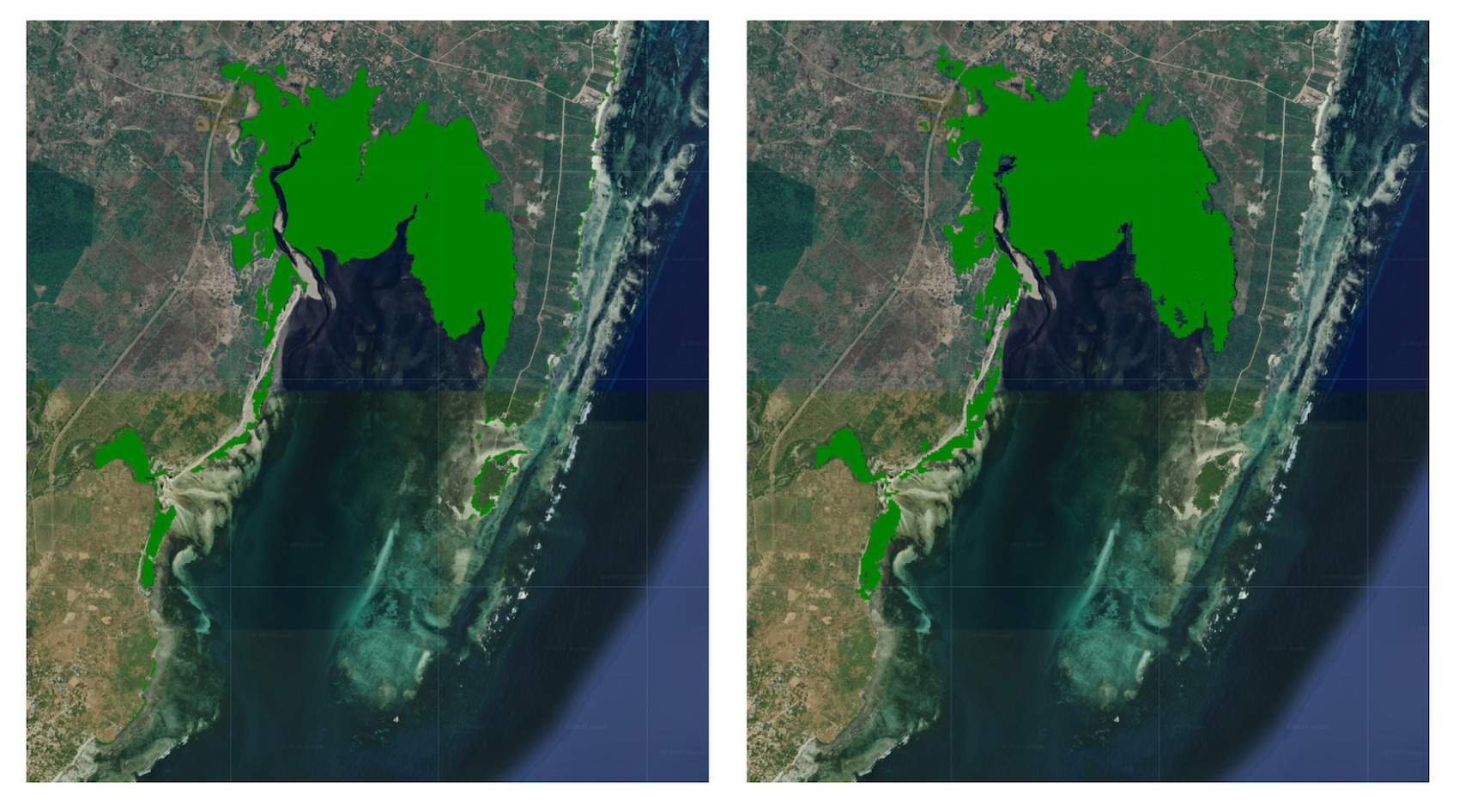 Figure: (left) Mangrove map from satellite embeddings (right) Mangrove map from GMW