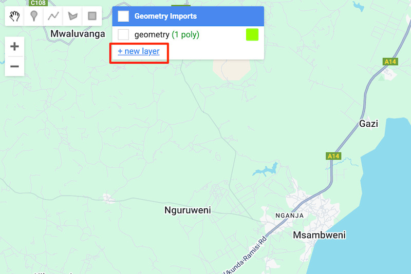 Let’s start by defining a region of interest. For this tutorial, we will pick a region along the Kenyan coastline and define a polygon as the geometry variable. Alternatively, you can use the Drawing Tools in the Code Editor to draw a polygon around the region of interest that will be saved as the geometry variable in the Imports.
