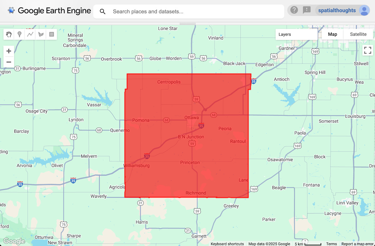 For this tutorial, we will map the grain silos in Franklin County, Kansas. We apply a filter and select the polygon for this county.