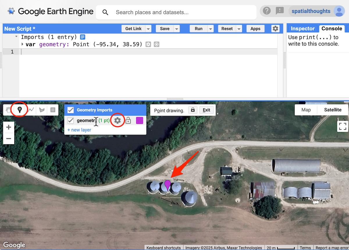 We start by marking the location of one or more grain silos. In the Code Editor, you can use the Satellite basemap, which makes it easy to locate objects.
