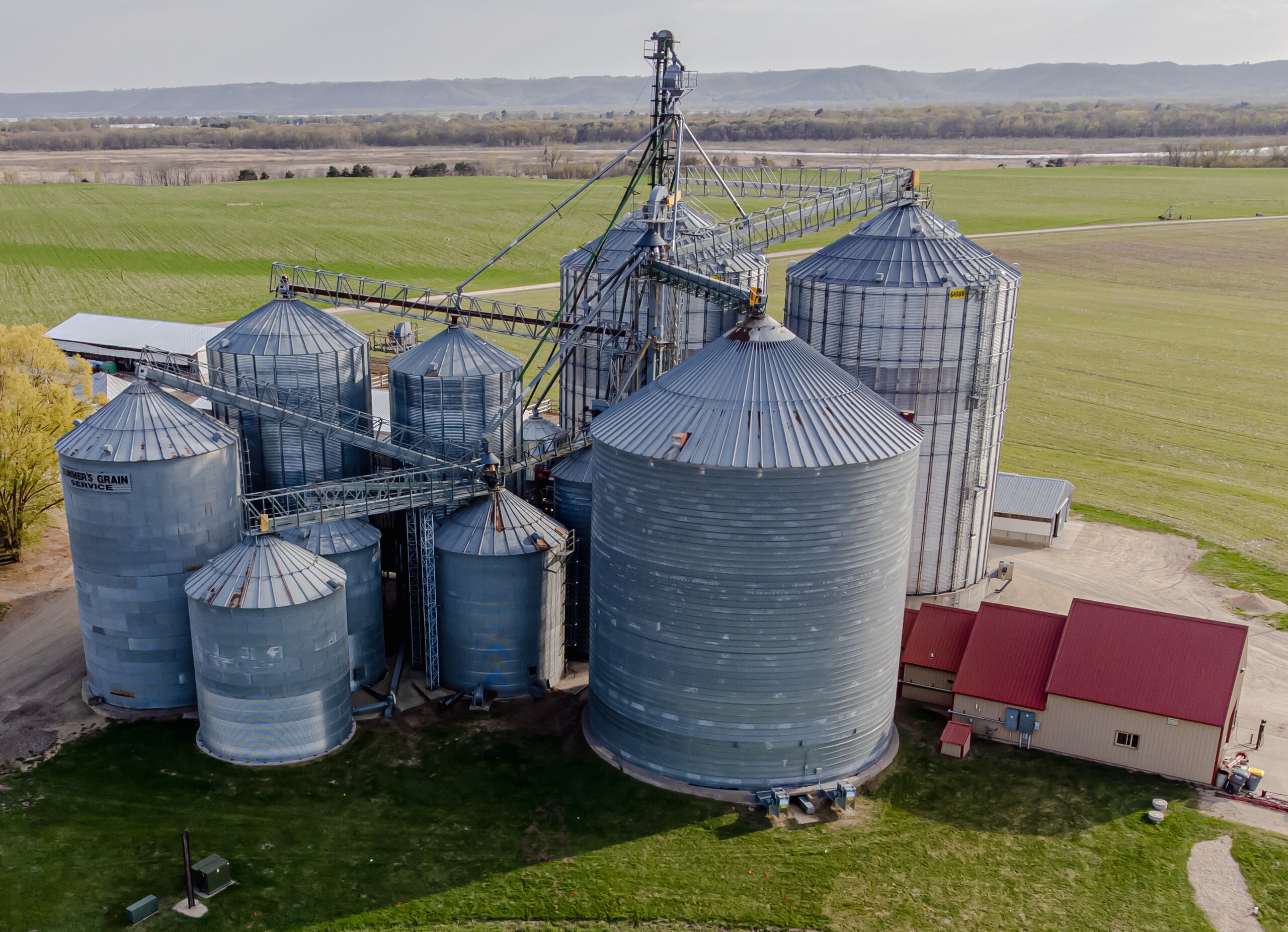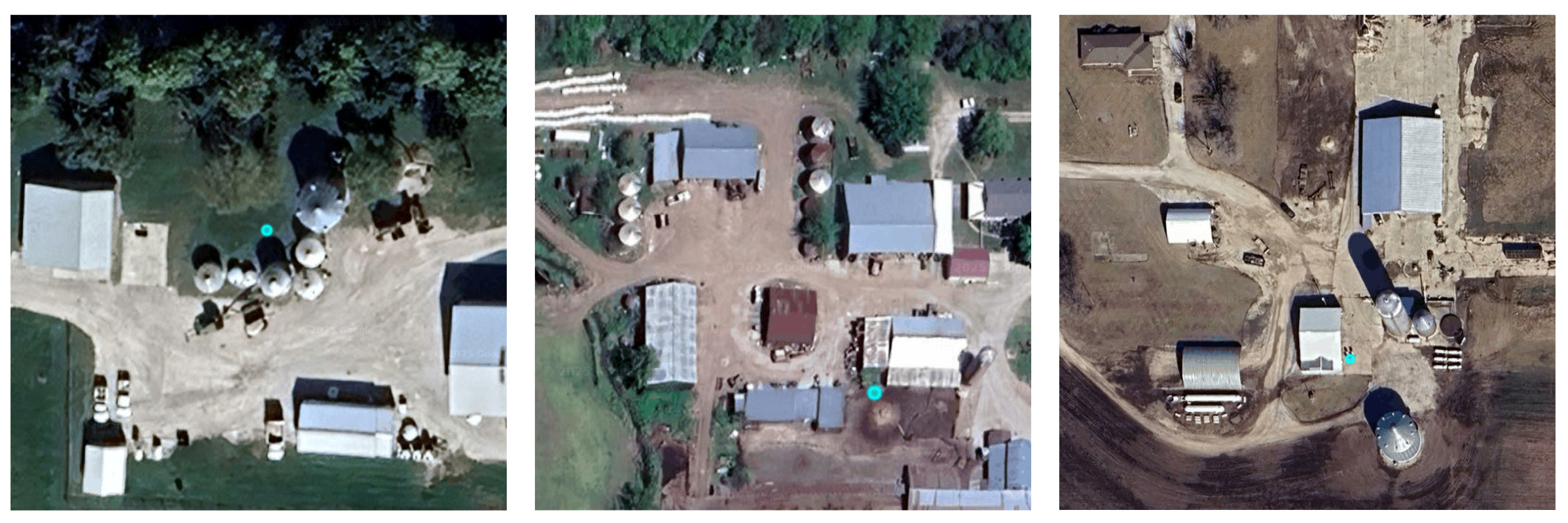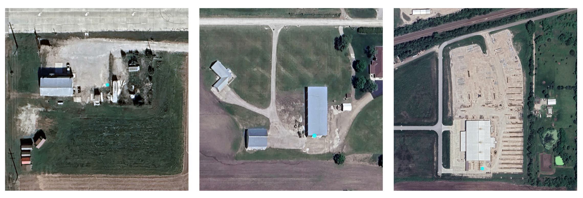For this tutorial, we will try to find all the grain silos in a region. Grain silos or grain bins are tall structures commonly used for bulk storage of grains. They are found at farms or processing facilities. Mapping these structures would be difficult with traditional remote sensing methods, and would require training a custom object detection model. Since silos have a unique shape, structure, and are typically made of similar materials, they will be represented with unique embedding vectors in the Satellite Embedding images, allowing us to locate them with a simple similarity search.