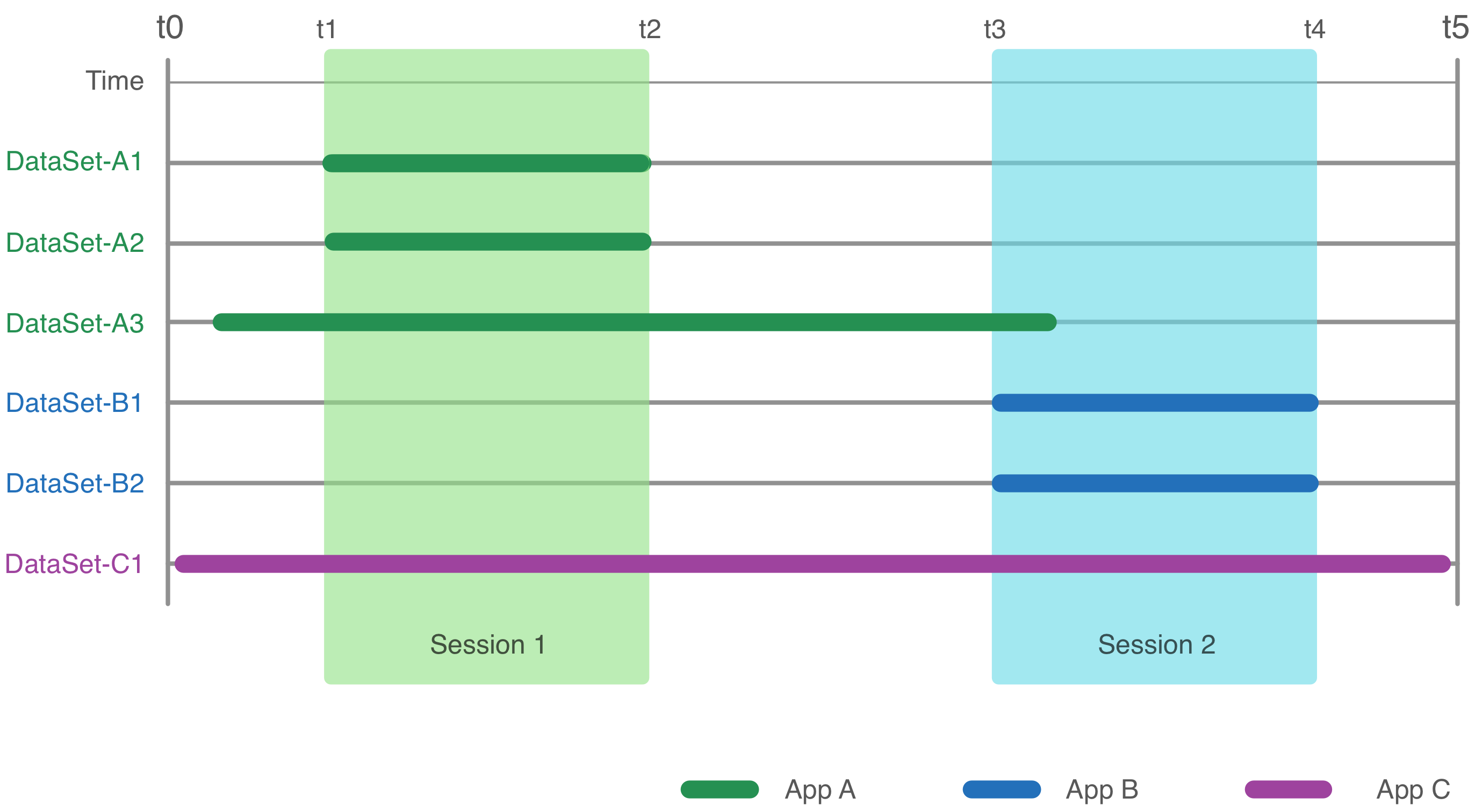 • أدرج التطبيق "أ" مجموعتَي البيانات A1 وA2 مع الجلسة 1، وA3 بشكل مستقل عن أي جلسات.