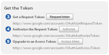 الحصول على رمز مميّز للطلب: https://www.google.com/accounts/OAuthGetRequestTokenمنح الإذن بالرمز المميز للطلب: https://www.google.com/accounts/OAuthAuthorizeTokenالترقية إلى رمز دخول: https://www.google.com/accounts/OAuthGetAccessTokenالتشابه مع AuthSub: