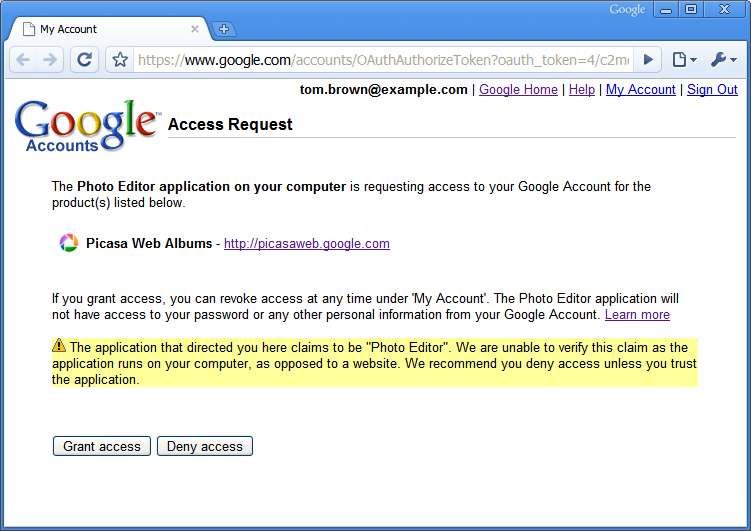 如果您的应用未注册,请在 OAuthGetRequestToken 请求中使用 xoauth_displayname 参数指定应用的名称。如果未指定该参数,Google 会显示 oauth_callback 参数提供的网址的域名。如果未提供任何回调网址,Google 会显示字符串“anonymous”。