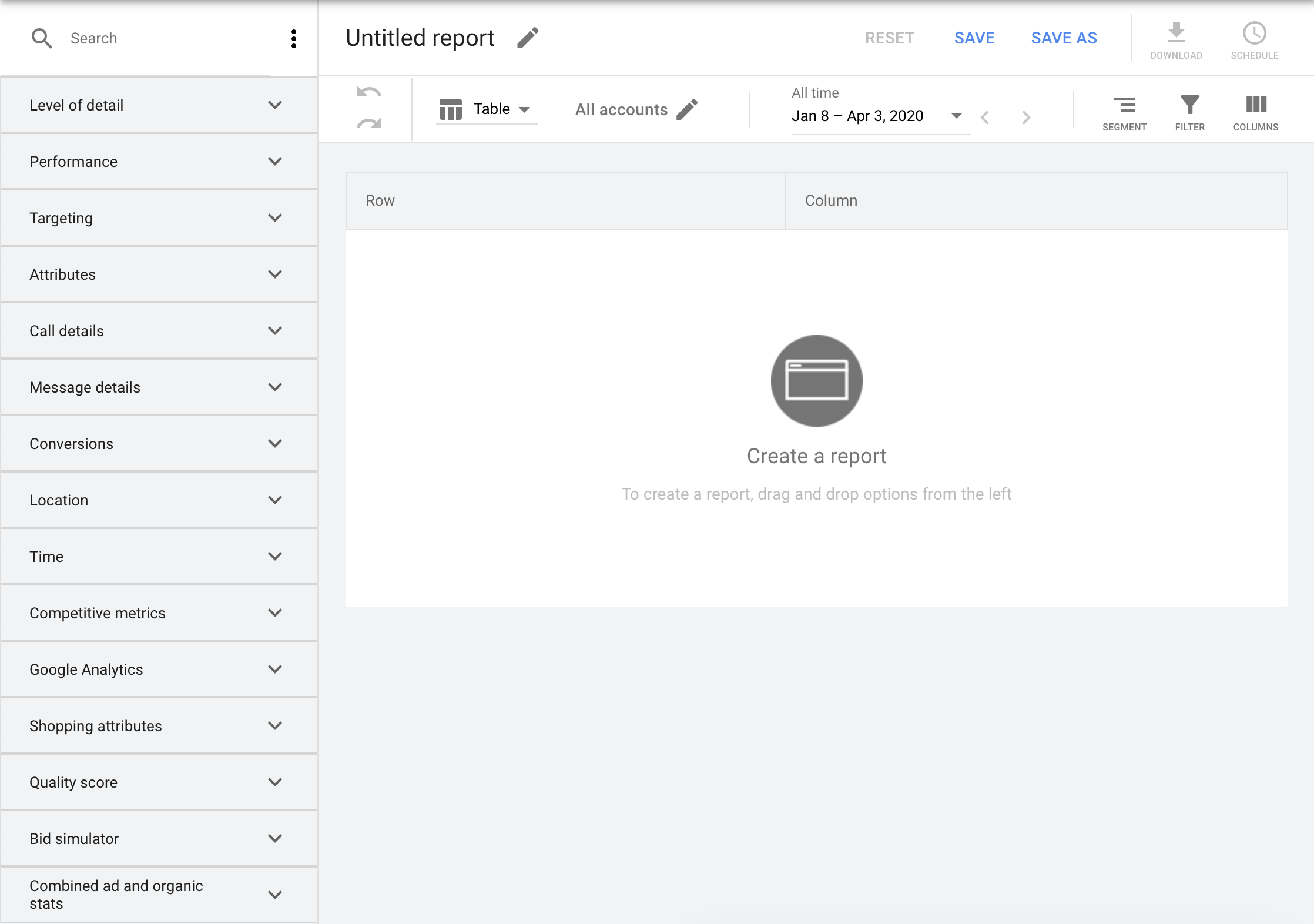 Vous pouvez créer une liste de rapports prédéfinis dans l'UI Google Ads.