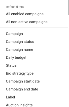Kullanıcı arayüzündeki filtreler, GAQL'nin WHERE yan tümcesindeki bir veya daha fazla koşula eşdeğerdir.
