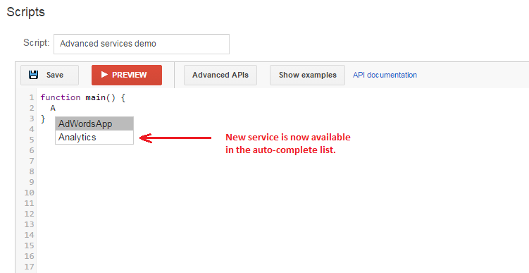As APIs avançadas nos scripts do Google Ads permitem que desenvolvedores experientes se conectem a determinadas APIs públicas do Google com menos configuração do que usando as interfaces HTTP. Você usa essas APIs como os serviços integrados dos scripts, e elas oferecem as mesmas conveniências, como preenchimento automático e autorização automática.
