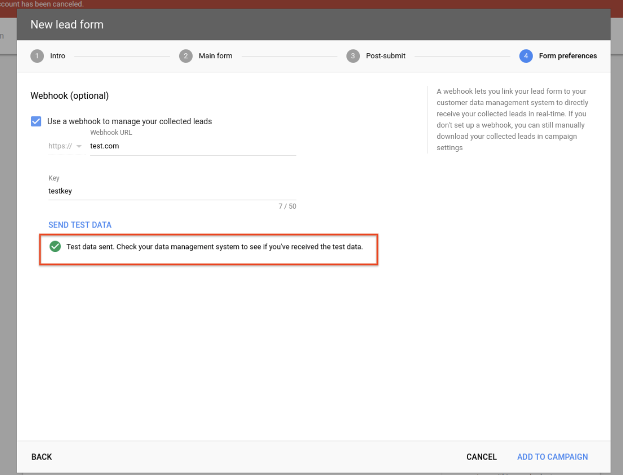Une fois le webhook configuré dans Google Ads, nous vous recommandons de vérifier si votre CRM configuré correctement à l'aide de la fonctionnalité de test. Sinon, vous risquez de ne pas recevoir les données sur les prospects dans votre système CRM.