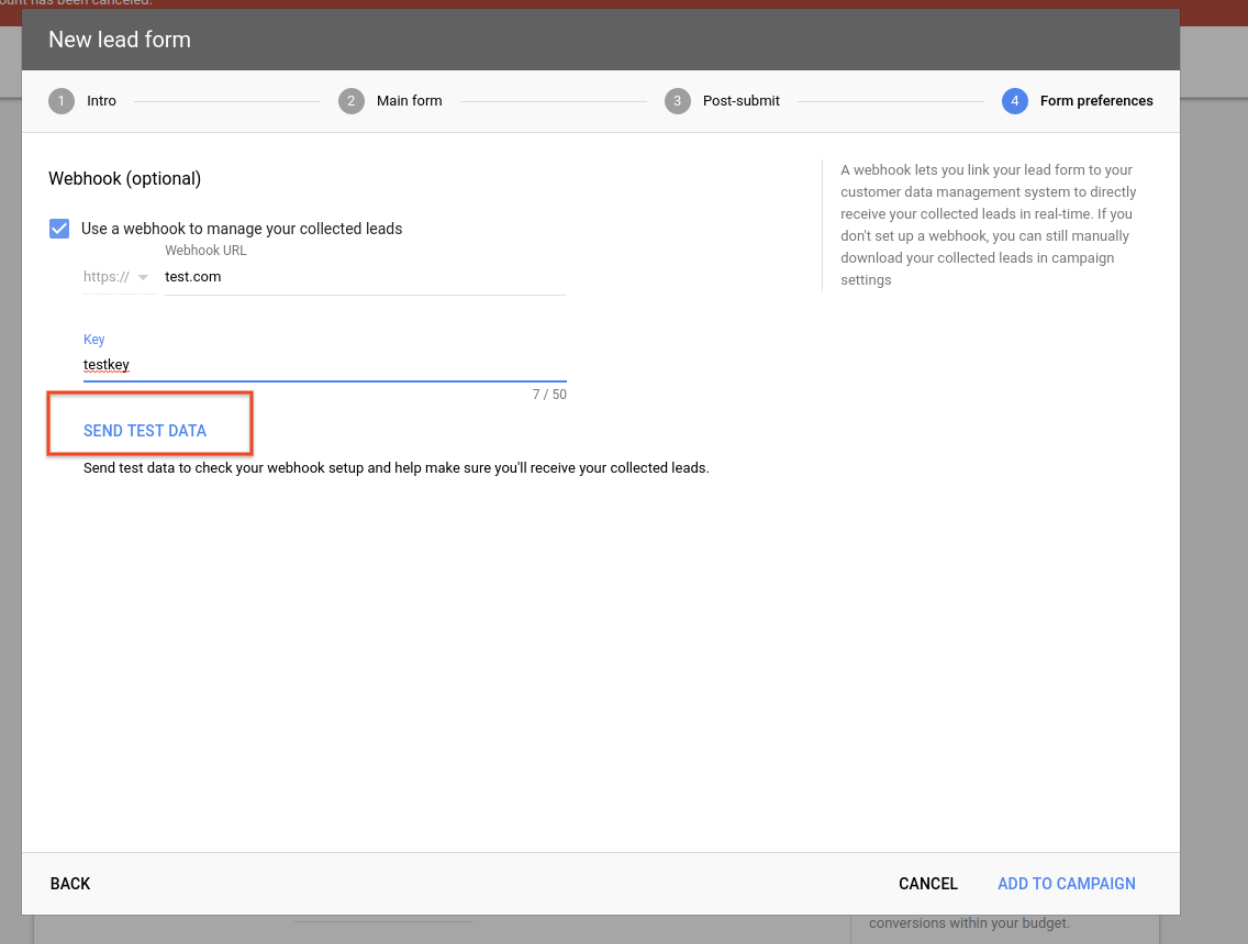 Depois de configurar o webhook no Google Ads, teste se o CRM está configurado corretamente usando a funcionalidade de teste. Caso contrário, você pode não receber os dados de lead no seu sistema de CRM.