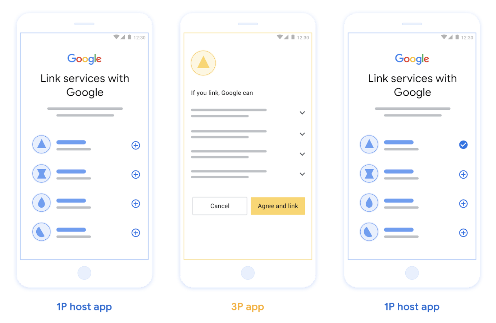 Selama proses penautan, Anda menerbitkan token akses ke Google untuk setiap Akun Google setelah mendapatkan izin pemegang akun untuk menautkan akun mereka dan membagikan data.