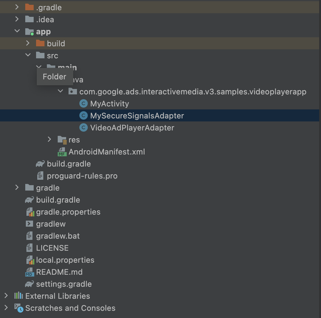 সুরক্ষিত সংকেত ব্যবহার করতে, সিগন্যাল সংগ্রহ করতে, সেগুলিকে এনকোড করতে এবং IMA SDK-এ পাস করতে আপনাকে অবশ্যই আপনার অ্যাপে একটি সংকেত সংগ্রাহক অ্যাডাপ্টার ক্লাস স্থাপন করতে হবে৷