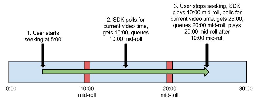 विज्ञापन के नियमों का इस्तेमाल करने पर, आपको क्लिक करके खींचने और छोड़ने की सुविधा से जुड़ी समस्या आ सकती है. खास तौर पर, जब कोई उपयोगकर्ता वीडियो में कई मिडरोल पॉड को आगे-पीछे करने के लिए क्लिक करके खींचता है, तो उसे कॉन्टेंट फिर से शुरू होने से पहले, उन पॉड में से दो या उससे ज़्यादा पॉड एक के बाद एक दिख सकते हैं. ऐसा तब होता है, जब उपयोगकर्ता के वीडियो को आगे-पीछे करने के दौरान, वीडियो प्लेहेड का समय अपडेट हो जाता है. अगर उपयोगकर्ता के विज्ञापन को आगे-पीछे करने के दौरान, SDK टूल मौजूदा समय के लिए पोल करता है, तो उसे लग सकता है कि विज्ञापन चलाया जाना चाहिए. कॉन्टेंट फिर से शुरू होने पर, वह विज्ञापन दिखाया जाता है. इसके बाद, उस विज्ञापन को दिखाया जाता है जिसे वीडियो को आगे-पीछे करने के बाद दिखाया जाना था. इस समस्या को विज़ुअल तरीके से समझने के लिए, यह डायग्राम देखें: