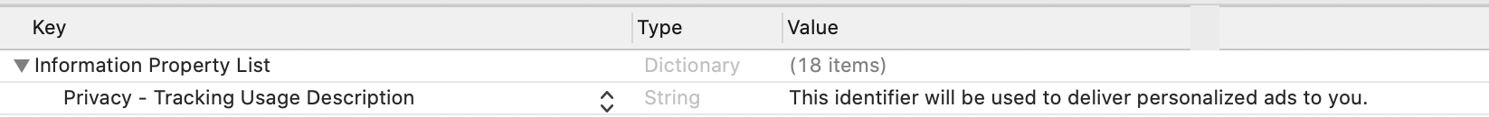 आईडीएफ़ए को ऐक्सेस करने के लिए, App Tracking Transparency की अनुमति मांगने का अनुरोध दिखाने के लिए, अपने Info.plist को अपडेट करें. इसके लिए, NSUserTrackingUsageDescription कुंजी जोड़ें. साथ ही, अपने इस्तेमाल के बारे में बताने वाला कस्टम मैसेज जोड़ें. यहां ब्यौरे के टेक्स्ट का एक उदाहरण दिया गया है:
