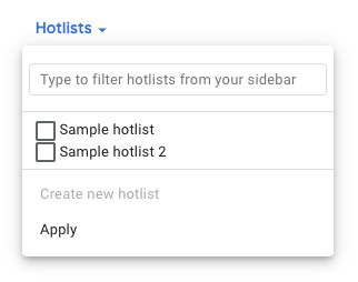 Puoi creare una nuova hotlist o filtrare quella esistente digitando le parole chiave nel campo di testo Digita per filtrare le hotlist dalla barra laterale nella parte superiore del selettore delle hotlist. La ricerca abbina le hotlist alle parole chiave nel titolo, ma non nella descrizione. Per creare una nuova hotlist con le parole chiave inserite nella barra di ricerca, fai clic su Crea nuova sotto il campo di ricerca. Puoi creare una hotlist nel selettore delle hotlist solo se le tue parole chiave non corrispondono esattamente a un risultato della ricerca. Quando crei una hotlist nel selettore delle hotlist, il problema associato viene aggiunto automaticamente alla hotlist.