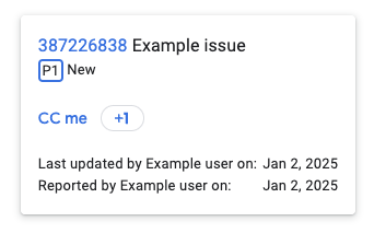 Google Sorun Takip Aracı'ndaki bir sorun, kullanıcının takip etmek istediği veya başka bir kullanıcının ya da ekibin takip etmesini beklediği hata raporu, özellik isteği, değişiklik isteği veya iş akışı öğesidir. Sorunlar, her biri ilgili bir sorun grubu içeren bileşenler halinde düzenlenir. Sorun Takip'teki her sorunun, kullanıcıların sorunla ilgili etkinliği takip ettiği, yorum yaptığı ve sorun verilerini güncellediği kendi ayrıntılar sayfası vardır.