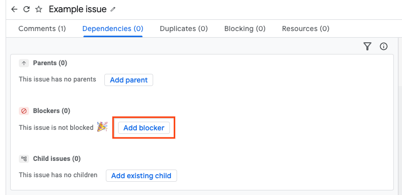 系統會在「Blocking」和「Dependencies」分頁中追蹤封鎖情況。舉例來說,如果您前往問題 A 的頁面,並將其設為封鎖問題 B,則問題 A 的頁面會在「Blocking」分頁中列出問題 B,而問題 B 的頁面則會在「Dependencies」分頁的「Blockers」部分列出問題 A。
