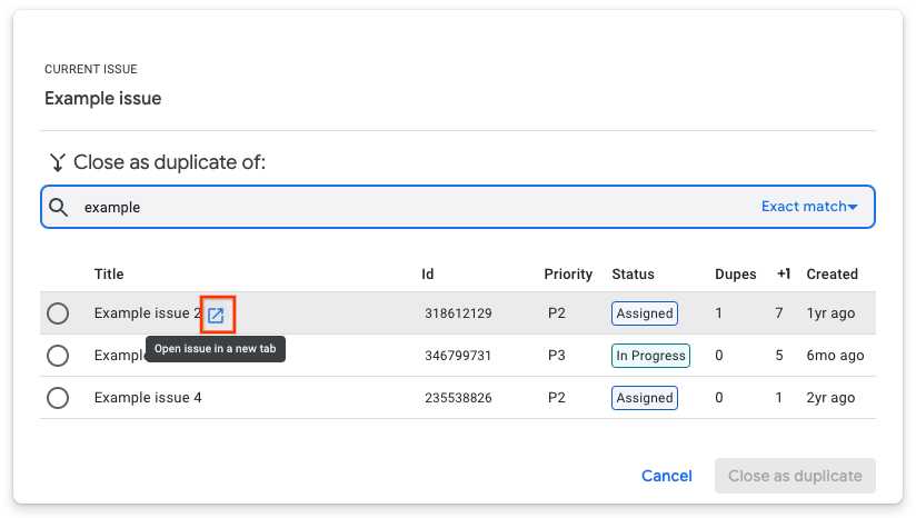Questa pagina mostra come contrassegnare un problema come duplicato di un altro in Google Issue Tracker. Quando contrassegni un problema come duplicato, il relativo stato viene modificato in Duplicato e il problema viene considerato chiuso.