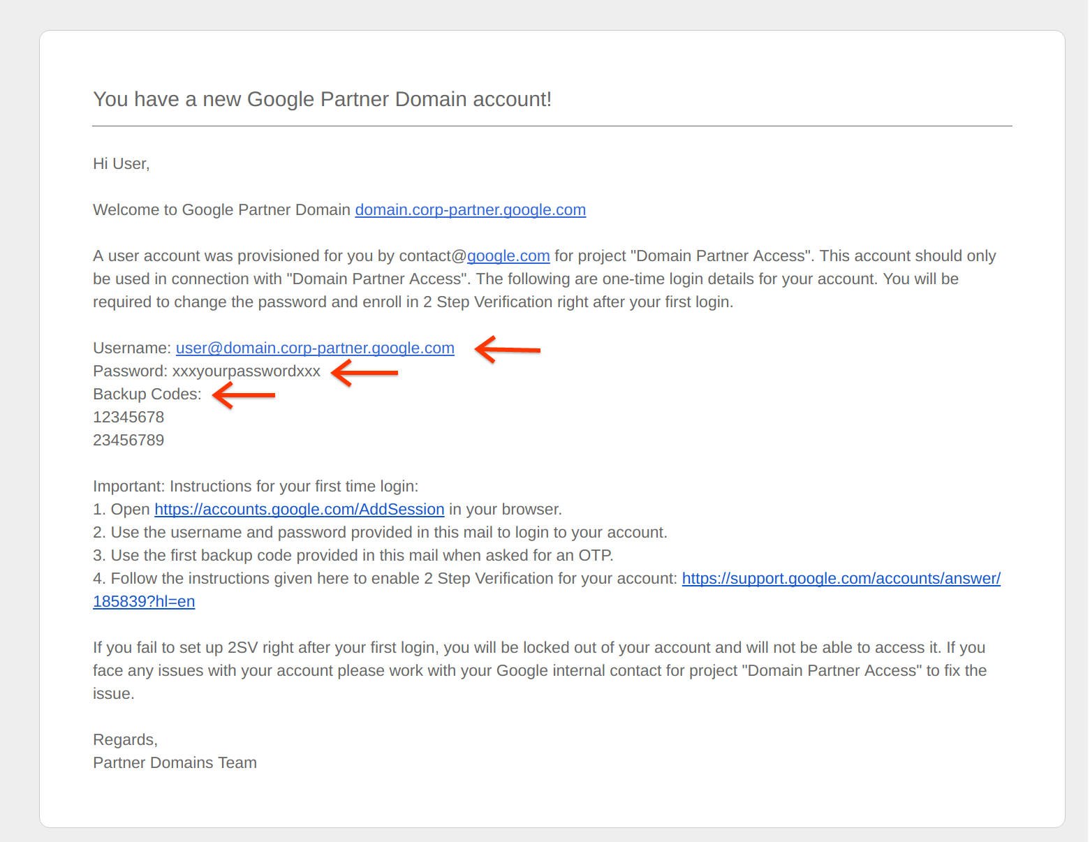 Este e-mail contém o endereço de e-mail do domínio do parceiro, a senha e os códigos alternativos. Ele também contém instruções importantes para configurar a verificação em duas etapas (2SV) na conta de e-mail do domínio do parceiro.