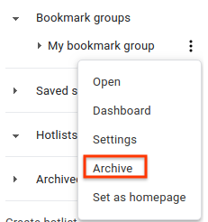 Archived bookmark group "My bookmark group".Saat grup bookmark diarsipkan, grup tersebut akan diarsipkan untuk semua pengguna grup.