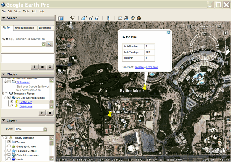 Voici un exemple qui crée un modèle <BalloonStyle> pour l'exemple de parcours de golf. Pour chaque infobulle de repère, Google Earth remplace le nom du repère, puis écrit les informations contenant le numéro de trou, le par et la distance pour chaque trou: