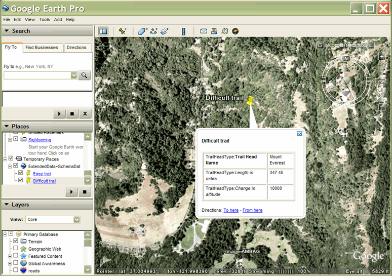 - Données XML arbitraires : permet de conserver les données utilisateur dans un fichier KML. Google Earth transmet ces données avec le fichier et l'enregistre, mais ne l'utilise pas.