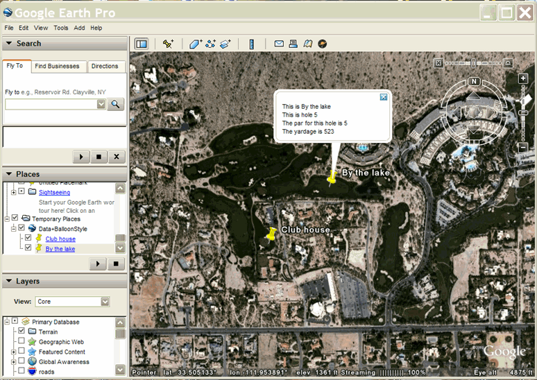 Di seguito è riportato un esempio che crea un modello <BalloonStyle> per il campo da golf. Per ogni fumetto del segnaposto, Google Earth sostituisce il nome del segnaposto e poi scrive le informazioni contenenti il numero del buco, il par e la yardage di ogni singolo buco: