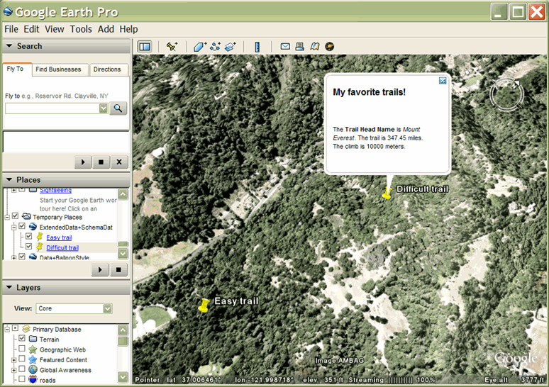 Il modo più semplice per aggiungere dati utente a una funzionalità è aggiungere i dati direttamente come valore di <ExtendedData>. Google Earth conserva questi dati, ma non li elabora.