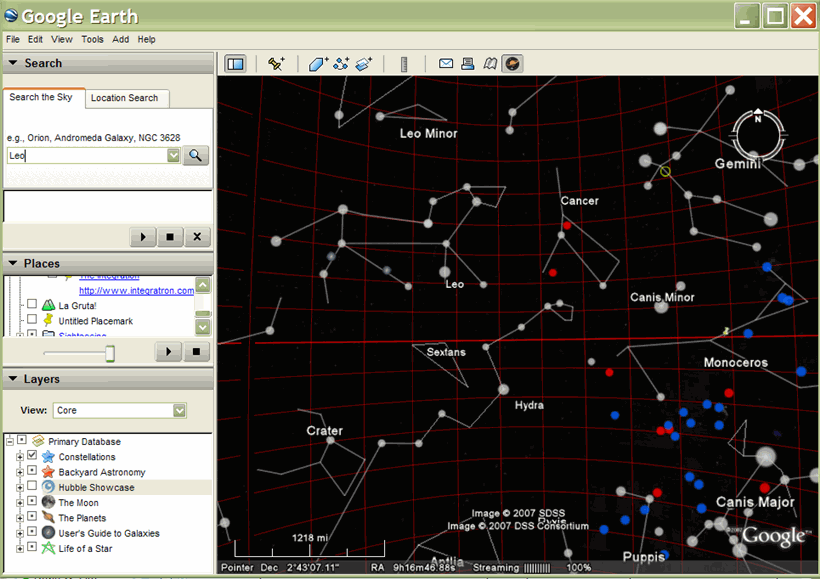 Google Earth उपयोगकर्ता कंट्रोल कर सकता है कि व्यू मोड > Sky में स्विच करें मेन्यू विकल्प या यूज़र इंटरफ़ेस में मौजूद स्काई बटन का इस्तेमाल करके, कब स्विच करना है. जब उपयोगकर्ता स्काई मोड में स्विच करता है, तो Google Earth, दुनिया भर की दूरबीनों से कैप्चर किए गए आसमान और बाहरी अंतरिक्ष की इमेज दिखाने के लिए ट्रांज़िशन करता है. आकाश का दृश्य ऐसा लगता है जैसे उपयोगकर्ता पृथ्वी के केंद्र में खड़े हों और आकाश की ओर देख रहे हों. यह मॉडल उपयोगकर्ताओं को उनके सिर से आकाश को और साथ ही खगोलीय गोले के उन हिस्सों को खोजने की अनुमति देता है जो आम तौर पर पृथ्वी के दूसरे पक्ष से ही दिखाई देंगे.