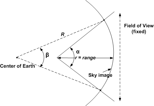 Wenn Sie das <LookAt>-Element mit Himmelsdaten verwenden, müssen Sie die folgenden Berechnungen zur Bestimmung des Bereichs durchführen. Die grundlegende Formel lautet: