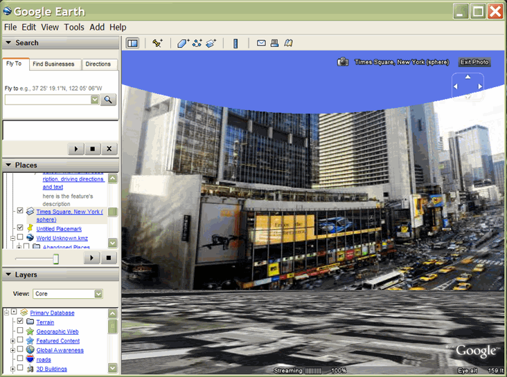Il nuovo elemento <FotoOverlay> ti consente di individuare geograficamente una foto sul pianeta e di specificare la posizione e l'orientamento della fotocamera che la visualizza. Overlay foto può essere un semplice rettangolo 2D, un cilindro parziale o pieno oppure una sfera (per panoramiche sferiche). L'overlay viene posizionato nella posizione specificata e orientato con la fotocamera.