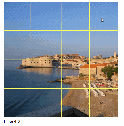 - แยกย่อยเป็นไทล์ รูปภาพในระดับนี้ประกอบด้วยตารางกริดแบบ 4 * 4 ไทล์ (ระดับ 2)
