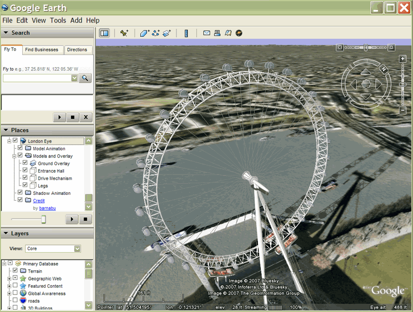 Ein weiteres Beispiel für die Verwendung des TimeSpan-Elements ist die Animation des London Eye, erstellt von James Stafford. Auf dem Display ist ein Modell des Riesenrads London Eye zu sehen. Das Modell wird in einer Reihe von Ortsmarkierungen referenziert, wobei jede eine unterschiedliche inkrementelle Rotation für das Modell und einen TimeSpan verwendet, der angibt, wie lange diese Ortsmarkierung angezeigt werden soll.