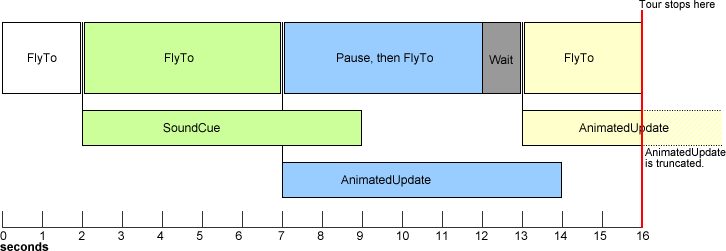 Tours are made up of a series of tour primitives - FlyTos, Waits, TourControls, AnimatedUpdates, and SoundCues. Some of these primitives are played one after the other, waiting for one primitive to complete before beginning the next. Others run parallel to other primitives, so that multiple actions can occur simultaneously.