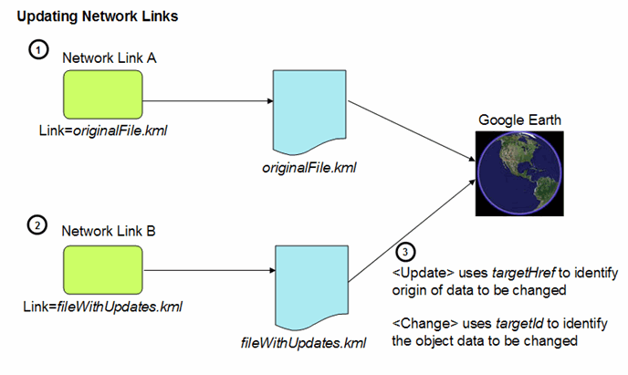 - NetworkLink lain memuat file KML kedua yang berisi pembaruan (kombinasi dari Ubah, Buat, dan Hapus) ke objek KML yang telah dimuat. File pembaruan berisi dua referensi untuk mengidentifikasi data KML asli: