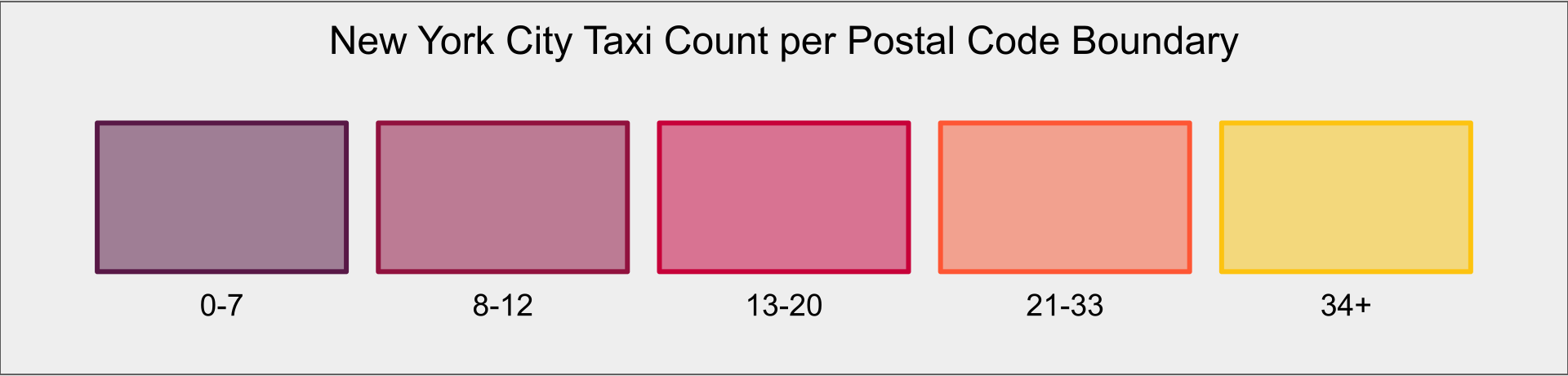 W tym przykładzie dostosujesz styl mapy na podstawie liczby taksówek w poszczególnych kodach pocztowych, aby użytkownicy mogli sprawdzić gęstość i dostępność taksówek w swojej okolicy. Styl będzie się różnić w zależności od wartości liczby taksówek. Obszary z najmniejszą liczbą taksówek będą oznaczone kolorem fioletowym, a gradient kolorów będzie przechodzić przez czerwony i pomarańczowy, aż do żółtego koloru taksówek w Nowym Jorku w przypadku obszarów o największej gęstości. W tym schemacie kolorów zastosujesz te wartości kolorów do parametrów fillColor i strokeColor. Ustawienie fillOpacity na 0,5 pozwala użytkownikom zobaczyć mapę bazową, a ustawienie strokeOpacity na 1,0 umożliwia odróżnienie granic wielokątów o tym samym kolorze: