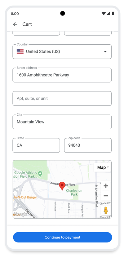 ব্যবহারকারী ঠিকানাটি প্রবেশ করানোর পর, Google আপনাকে চেকআউটের সময় ঠিকানা যাচাইকরণ API-তে কল করার পরামর্শ দেয় যাতে ঠিকানাটি বৈধ এবং সম্পূর্ণ কিনা তা নিশ্চিত করা যায়। ব্যবহারকারী ঠিকানা ফর্মের পরবর্তী বা চালিয়ে যান বোতামে ক্লিক করার পরে ঠিকানা যাচাইকরণ API-তে একটি কল ট্রিগার করুন। এই বোতামটি প্রায়শই পেমেন্ট পৃষ্ঠায় নিয়ে যায়।