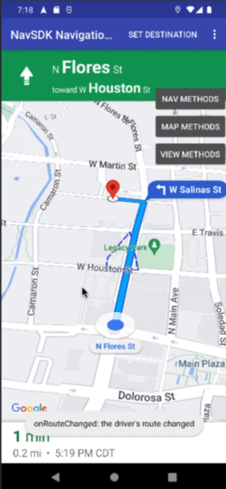 - אירועים של מרחק שנותר וזמן משוער להגעה (קבלת התראה כשהנהג עומד להגיע ליעד – על סמך מטרים, קבלת התראה כשהנהג עומד להגיע ליעד – על סמך זמן) – שניהם זמינים דרך RemainingTimeOrDistanceChangedListener.