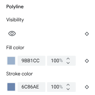 Spessore tratto: lo spessore del contorno di poligoni e polilinee. I risultati potrebbero variare in base al livello di zoom. Se non vuoi un contorno, imposta il colore tratto in modo che sia uguale al colore di riempimento oppure imposta la larghezza del tratto su 0.