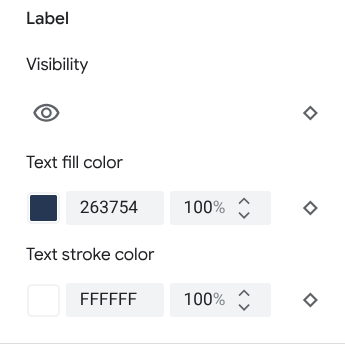 完全或部分以標籤表示的地圖項目類型 (例如「Point of interest」(搜尋點) 或「Transportation」(交通運輸)),通常可以設定下列元素的樣式:「Visibility」(顯示設定)、「Icon color」(圖示顏色)、「Text fill color」(文字填滿顏色) 和「Text stroke color」(文字邊框顏色)。