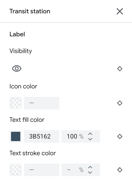 Đối với các loại đối tượng trên bản đồ được biểu thị một phần hoặc toàn bộ bằng nhãn, chẳng hạn như Giao thông vận tải và các loại không phải Địa điểm yêu thích khác, bạn thường có thể tạo kiểu cho các phần tử sau: Khả năng hiển thị, Màu biểu tượng, Màu nền văn bản và Màu nét văn bản.