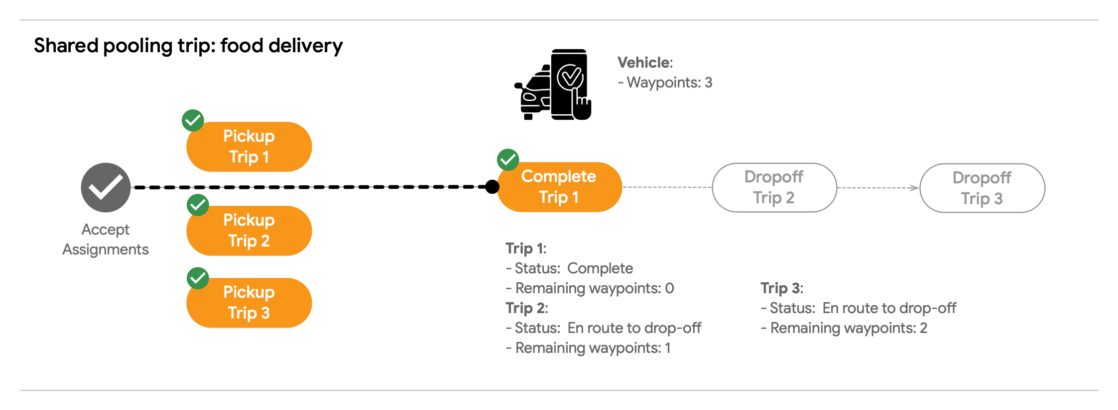 たとえば、新しいライドシェア リクエストを、限定乗車のみをサポートし、乗車を完了している車両に割り当てることができます。この場合、旅行を連続した旅行としてモデル化します。このようなルートを割り当てる場合、システムは新しいルートのウェイポイントが進行中のルートのウェイポイントの後に表示されるようにする必要があります。