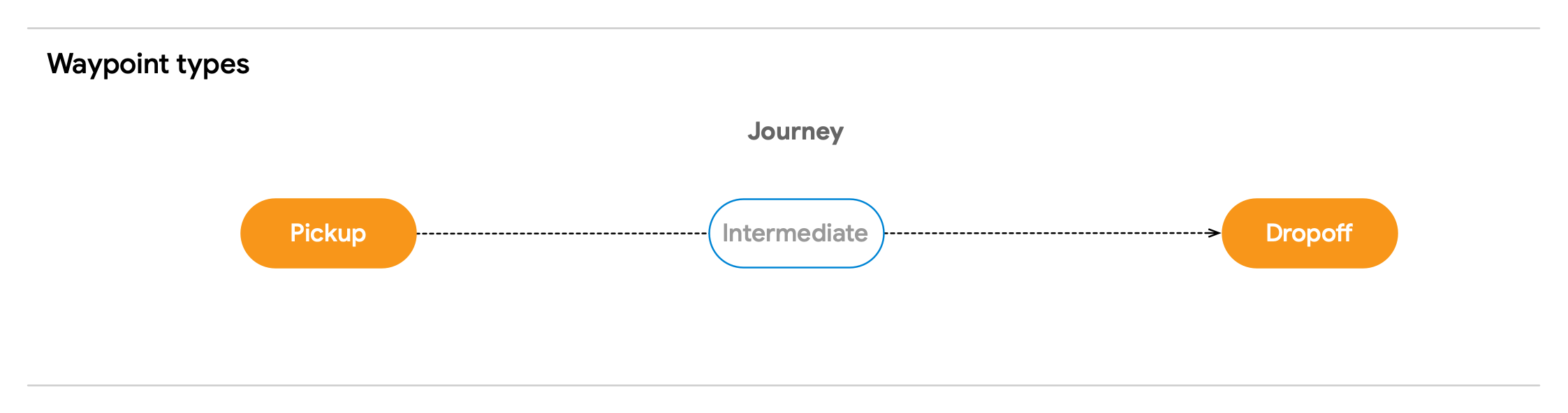 remaining_waypoints的欄位。其中包含車輛必須依序前往的路線點,才能抵達行程的最終下車點。請參閱「行程情境」中的情境。- 對於指派給車輛的單一目的地行程,且該車輛在其行程表中沒有其他行程,則只會包含上車和下車地點,假設車輛未離開上車路徑點。