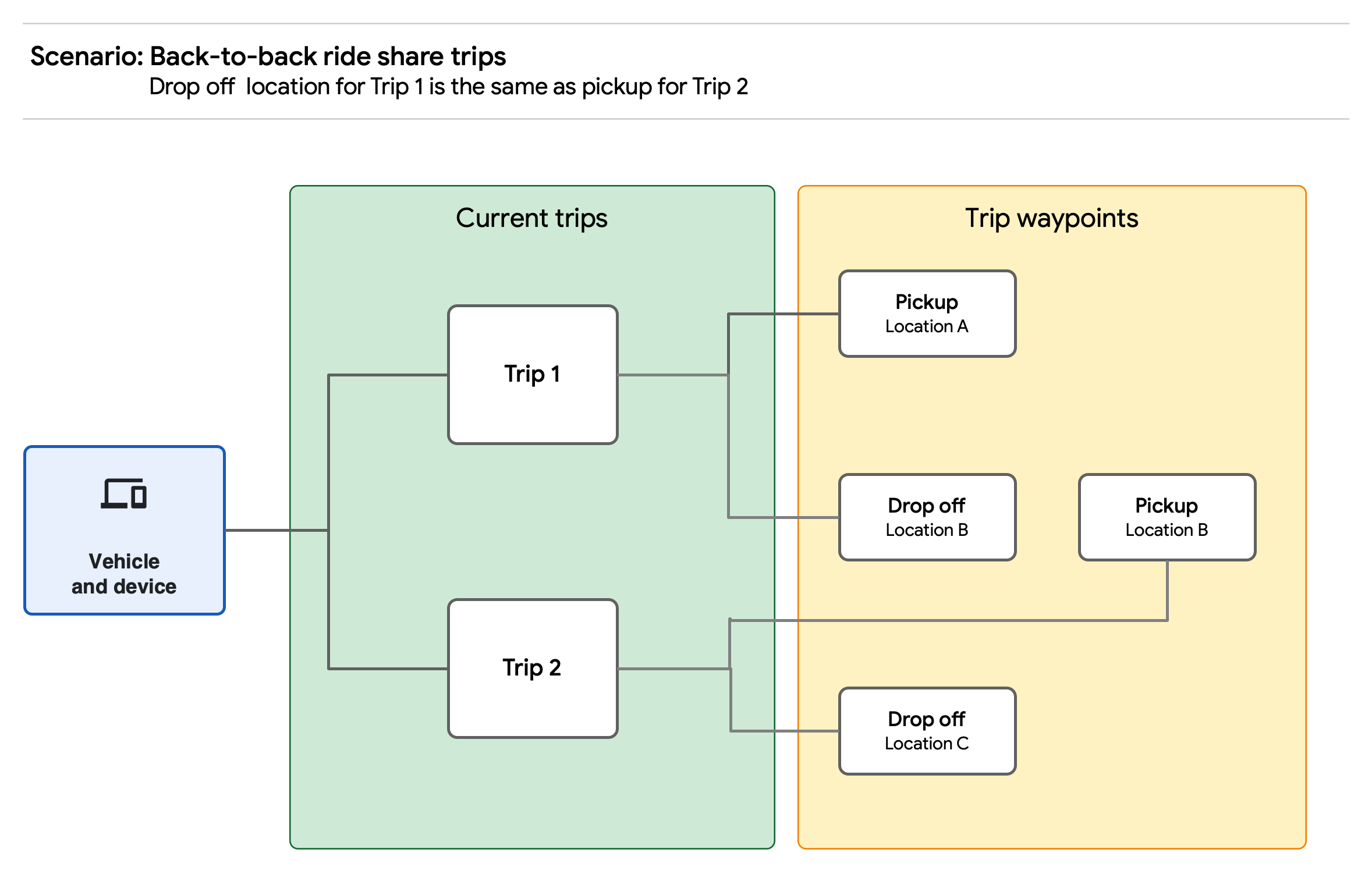 Ten scenariusz przedstawia plan podróży z różnymi przystankami i zadaniami. lokalizacji. Uwaga: Fleet Engine nie przechowuje informacji adresowych. Wykorzystanie na tym schemacie pokazuje, jak pojazd może zatrzymać się na lokalizację powiązaną z zadaniami, które mają oddzielne lokalizacje.