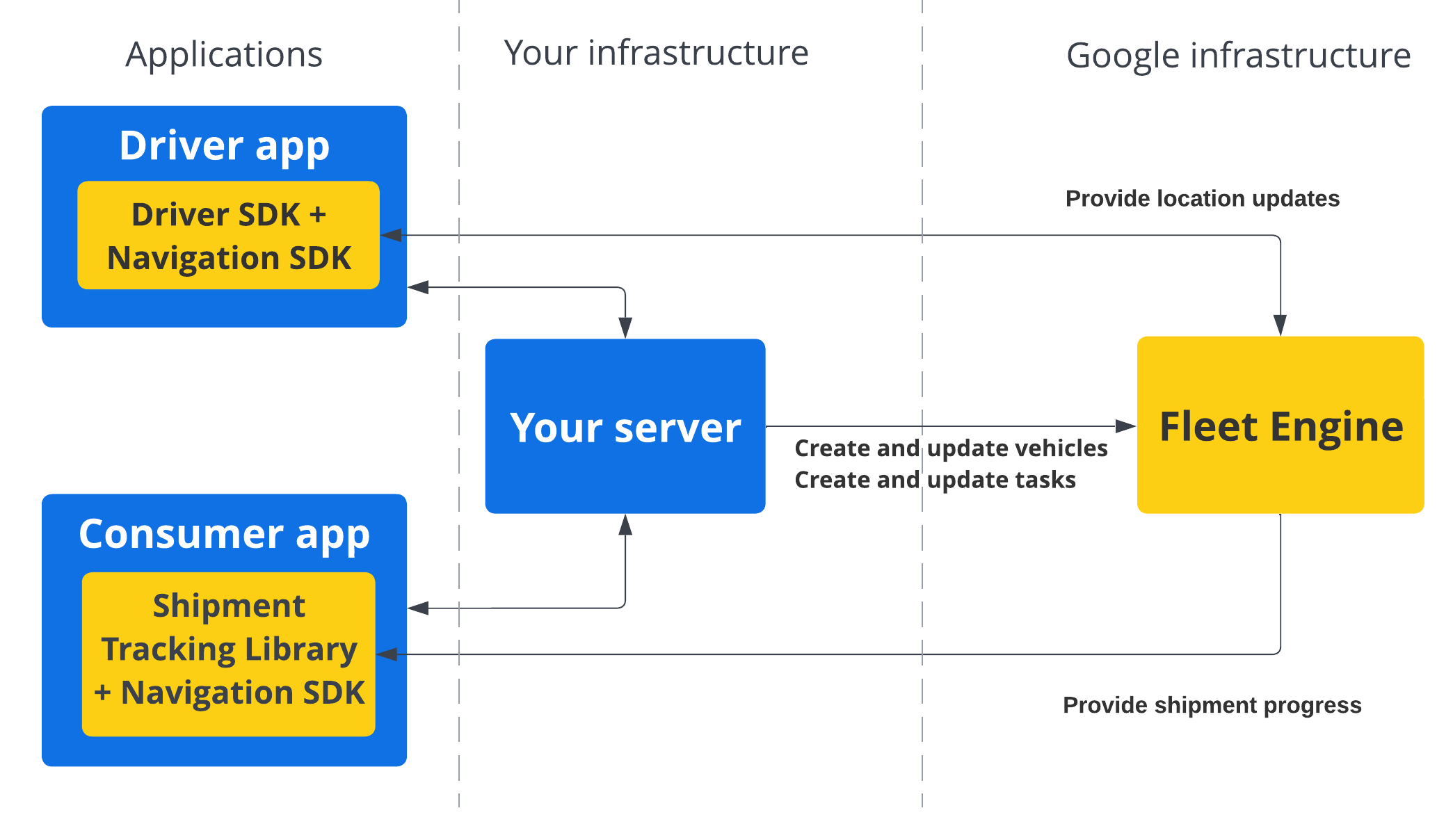 Cette section présente une architecture système pour les différentes offres Fleet Engine. Les deux services utilisent les éléments suivants :